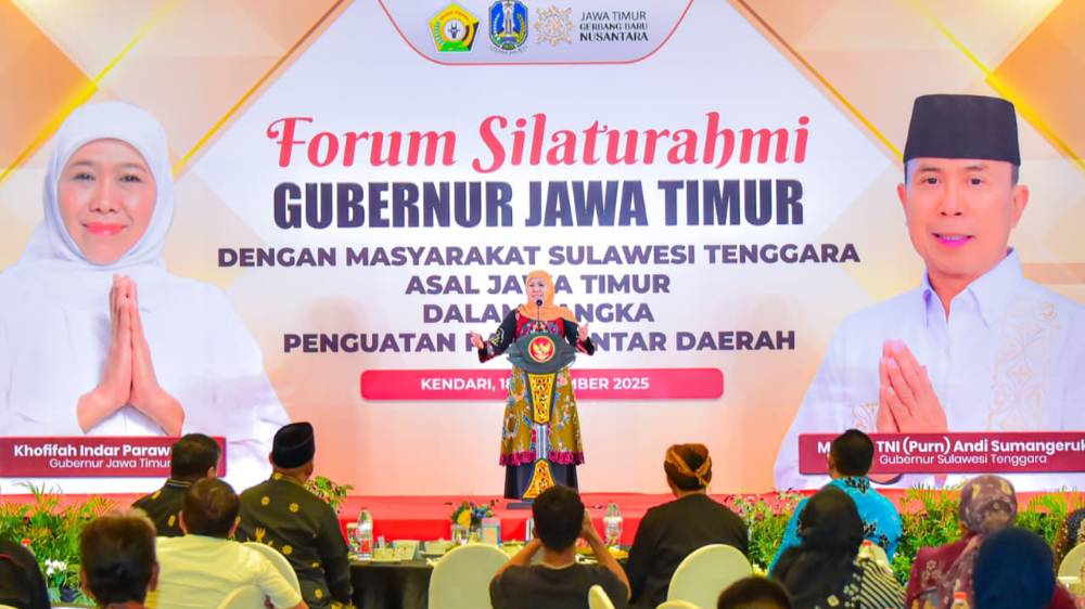 GIANESIA.COM – KENDARI, 19 NOVEMBER 2025 – Gubernur Jawa Timur Khofifah Indar Parawansa menggelar Forum Silaturahim dengan Masyarakat Sulawesi Tenggara (Sultra) Asal Jawa Timur dalam Rangka Penguatan Pasar Antar Daerah yang digelar di Hotel Plaza Inn Kendari, Selasa (18/11) malam.