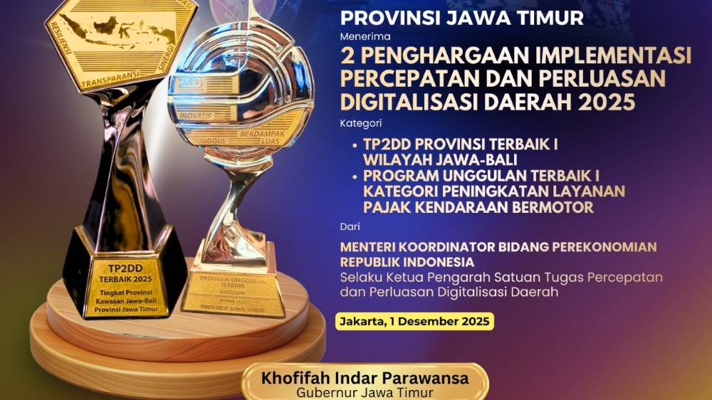 GIANESIA.COM – Provinsi Jawa Timur kembali mencatatkan prestasi gemilang dengan meraih dua penghargaan terbaik pertama Implementasi Percepatan dan Perluasan Digitalisasi Daerah Terbaik Tahun 2025 dalam ajang Implementasi Tim Percepatan dan Perluasan Digitalisasi Daerah (TP2DD) yang diselenggarakan Kementerian Koordinator Bidang Perekonomian RI di Ballroom Hotel Kempinski Jakarta, Senin (1/12).