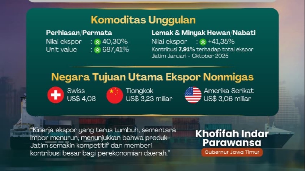 Menurutnya, capaian ini menjadi bukti konkret bahwa produk-produk Jawa Timur mampu bersaing di pasar internasional dan berkontribusi kuat terhadap stabilitas ekonomi daerah.