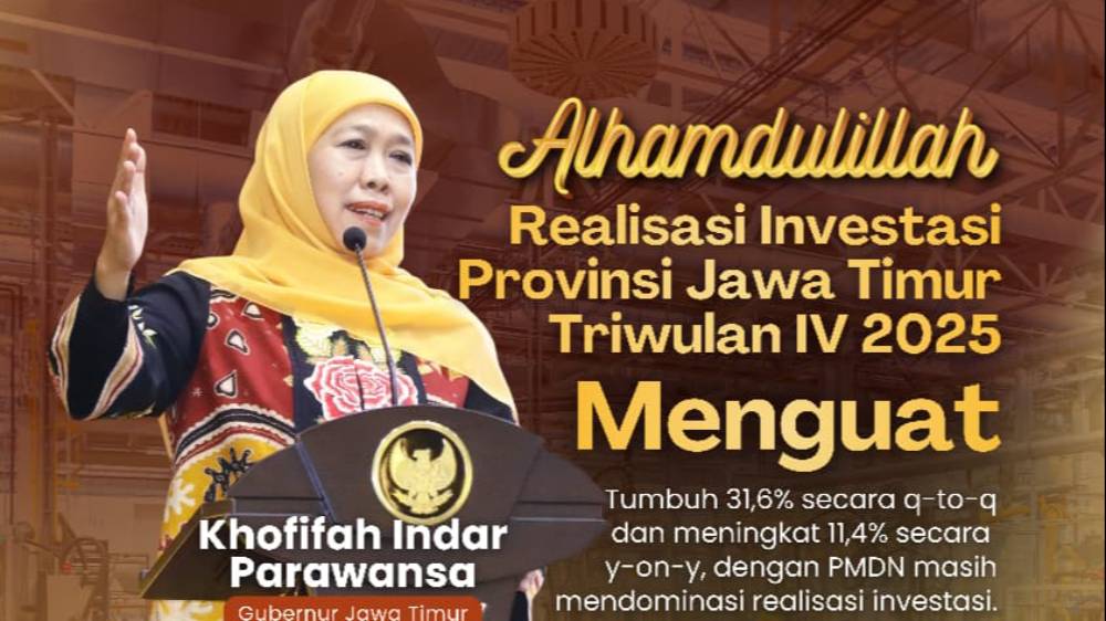 Realisasi investasi di Jawa Timur sepanjang tahun 2025 mencatatkan capaian yang sangat positif dan melampaui target.